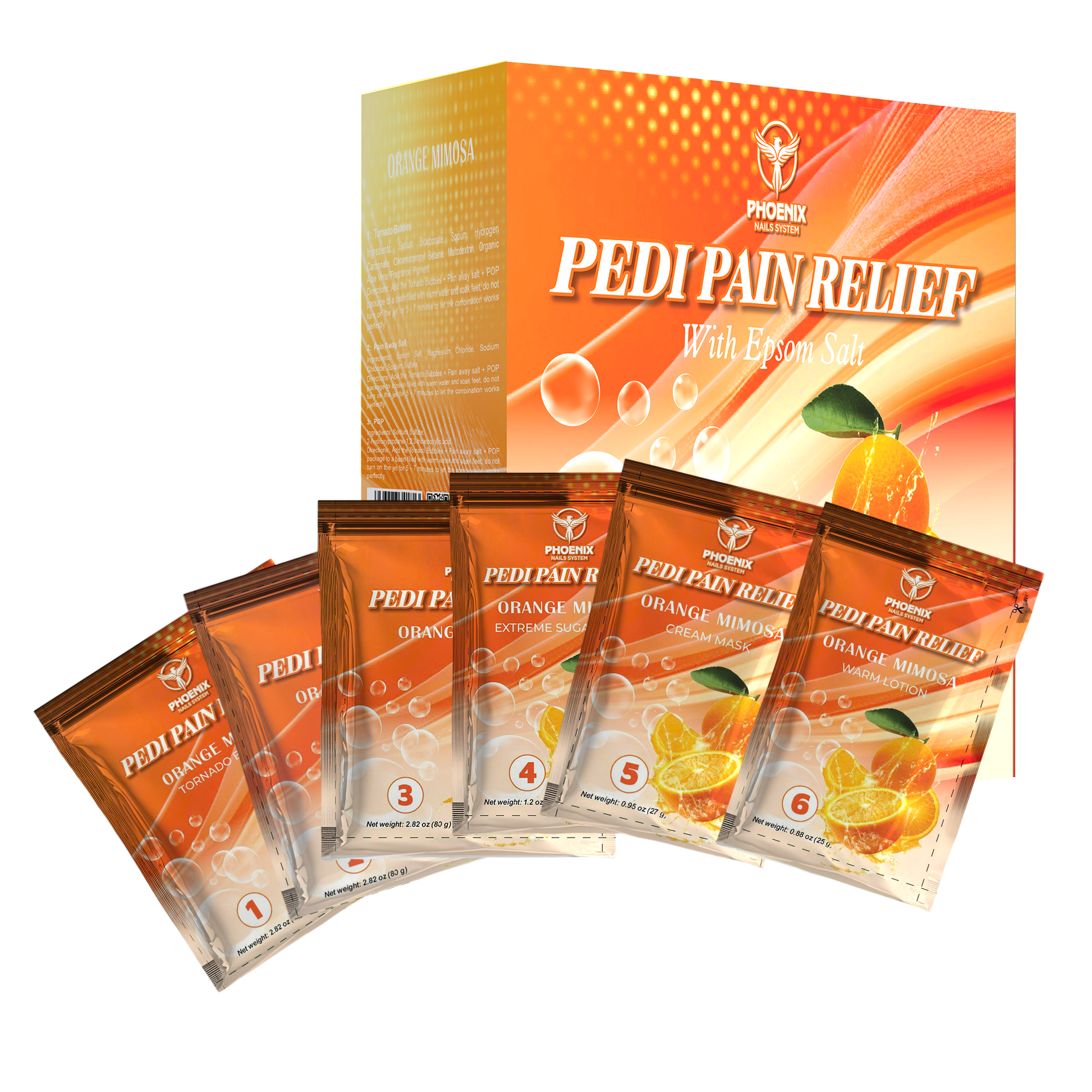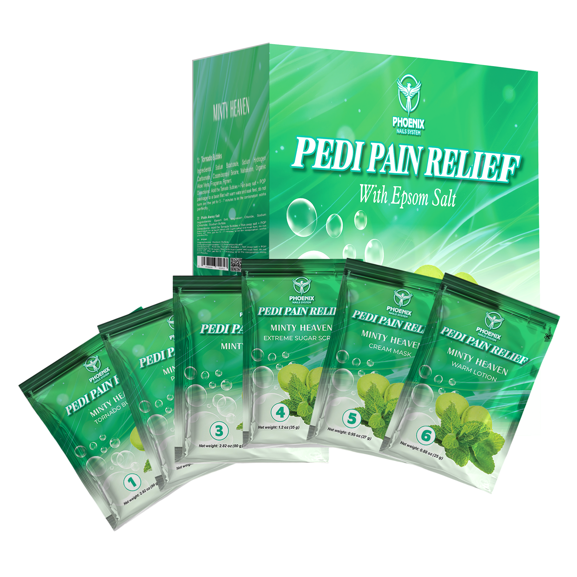 The Phoenix Pedi Relief kit combines six expert steps to soothe and rejuvenate feet. It starts with Tornado Bubbles to gently cleanse and invigorate, followed by Pain Away Salts that help relieve discomfort and reduce swelling. The Pop treatment refreshes and energizes, while the Extreme Sugar Scrub exfoliates deeply for smooth skin. The Cream Mask nourishes and renews, and the warm lotion locks in moisture for lasting comfort. Included are a four-piece pedicure kit and spa liner, making this a complete solution for restoring foot health and relaxation.